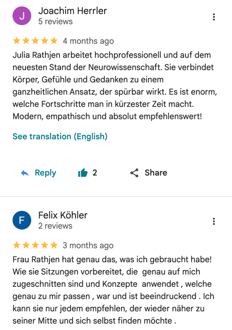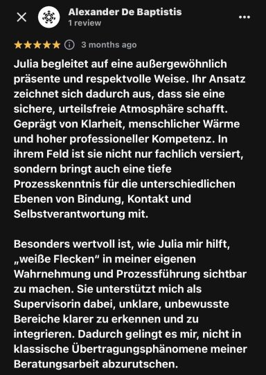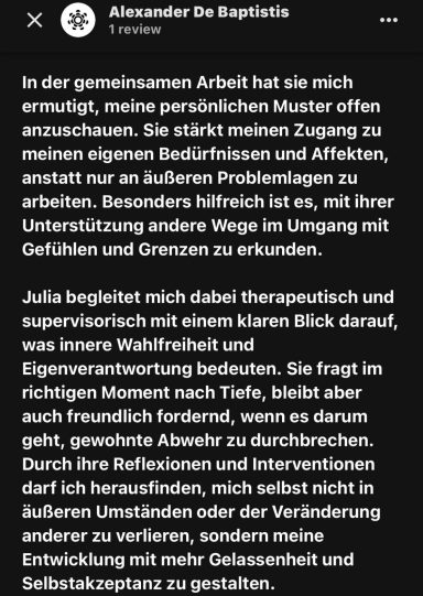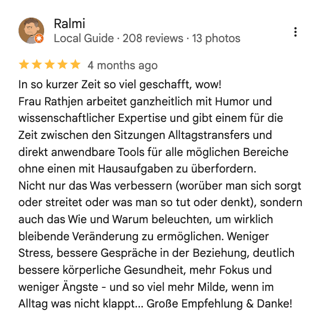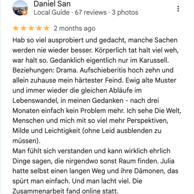 Es gibt sogar schnelle Erfolge, aber eigentlich geht es um die Herbeiführung nachhaltiger Veränderungen und die Entwicklung von Fähigkeiten, Unerwartetem, Unbequemem und Unverständlichem aktiv und flexibel zu begegnen. Die Zusammenarbeit mit Julia Rathjen hat bei mir vieles in Bewegung gesetzt. Dafür bin ich ihr sehr dankbar und möchte sie daher sehr gerne weiterempfehlen.