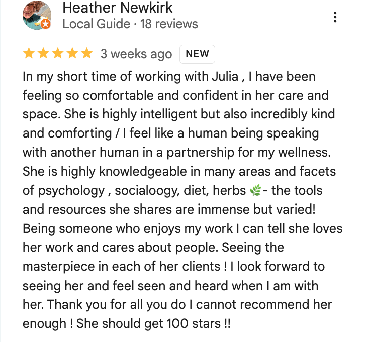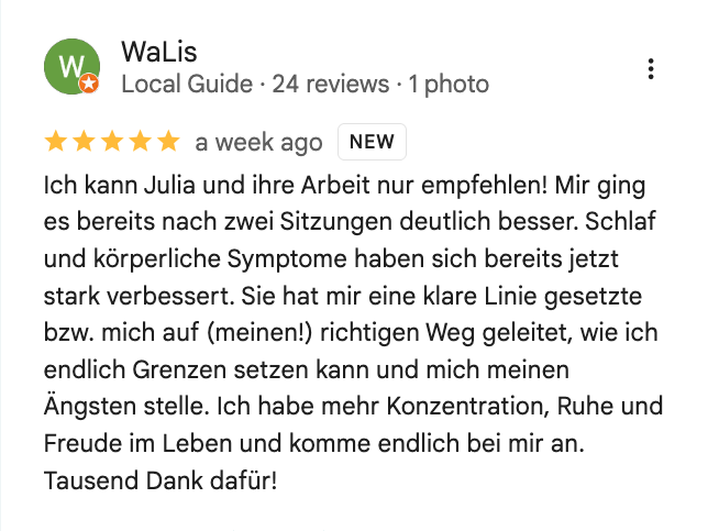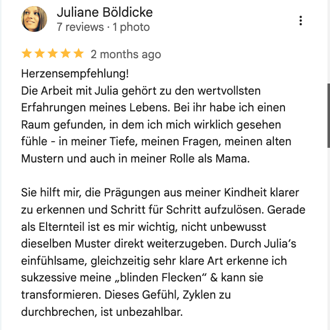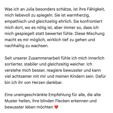 Ich habe diesen wunderbaren Menschen getroffen. Julia Rathjen vereint auf eine einzigartige, empathische Weise wissenschaftlich fundiertes Wissen und anwendungsspezifische Methodik. Behutsam und doch gezielt legt sie Verbindungen offen und stärkt körperliche, emotionale und mentale Kräfte der Selbstwirksamkeit, auch indem sie Verbindungen zwischen diesen aufzeigt.